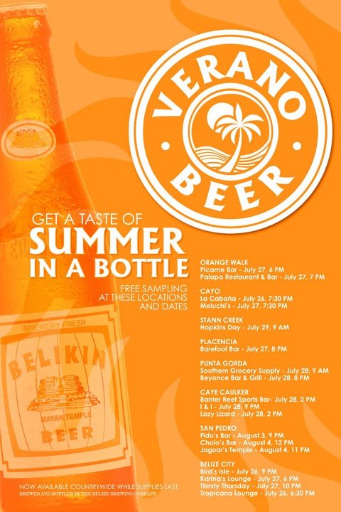 Belikin Beer’s new Verano Beer – Summer in a Bottle – is quite good, and they will be giving free samples away tonight and tomorrow. Tonight, in Belmopan, at La Cabana, starting at 7:30pm, you can try Verano. Saturday night at Meluchi’s, at 7:30pm, you can also try it. It has a good taste to it. Their new brewmaster is really earning his keep with the 3 great new flavors released in the last year.
